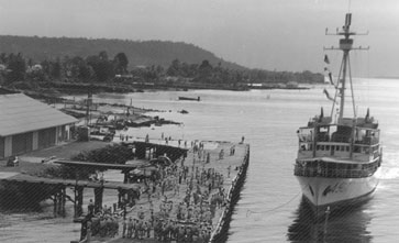 Daar komt de Hr.Ms. Luymes in Biak aan.