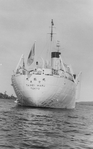 En er liggen vaak schepen in de baai. Dit is een Japans schip Tasei Maru uit Tokyo. Hij kwam een gedenksteen plaatsen voor de gevallen Japanners in de 2e wereld oorlog. terug volgende index