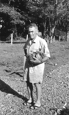Dhr Mulder van maripi met cocosnoot in de hand. Daar voeren we vaak met de prauw naar toe. terug volgende index