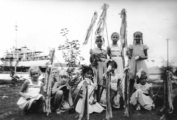 Sanggeng 4 september 1957. Op Jorie Zwart haar verjaardag. Op de achtergrond ligt het schip de "Snellius" in de baai. terug volgende index