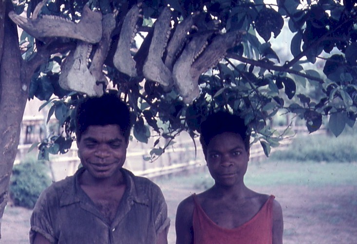 Mannen met opgespaarde varkenskoppen.