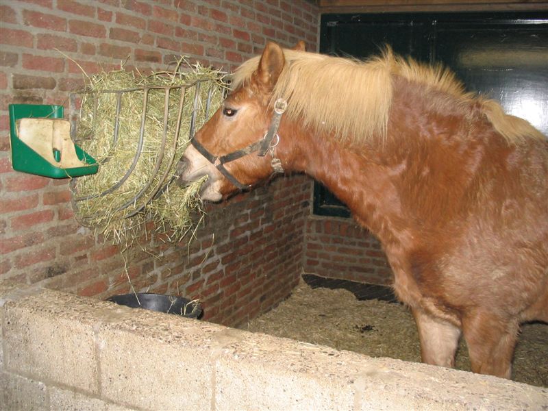 Maaike het paard is aan het eten. Ze trekt de huifkar.