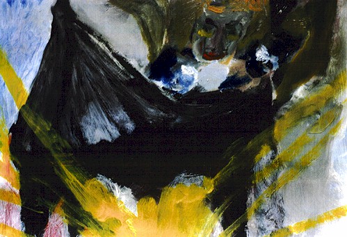 Mozart als engel met vleugels in de wolken achter de vleugel aan het pianospelen 18 augustus 1998