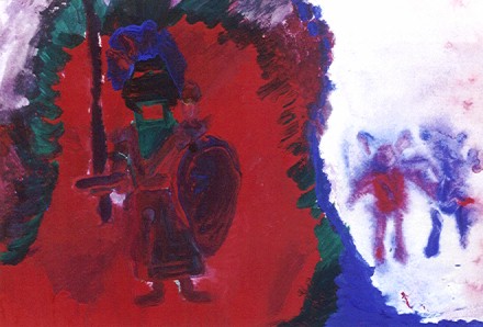 Rechts twee engelen en een duivel links. De engelen moeten maar eens naar de hel gaan kijken. De duivel moet maar eens een kijkje in de hemel nemen.